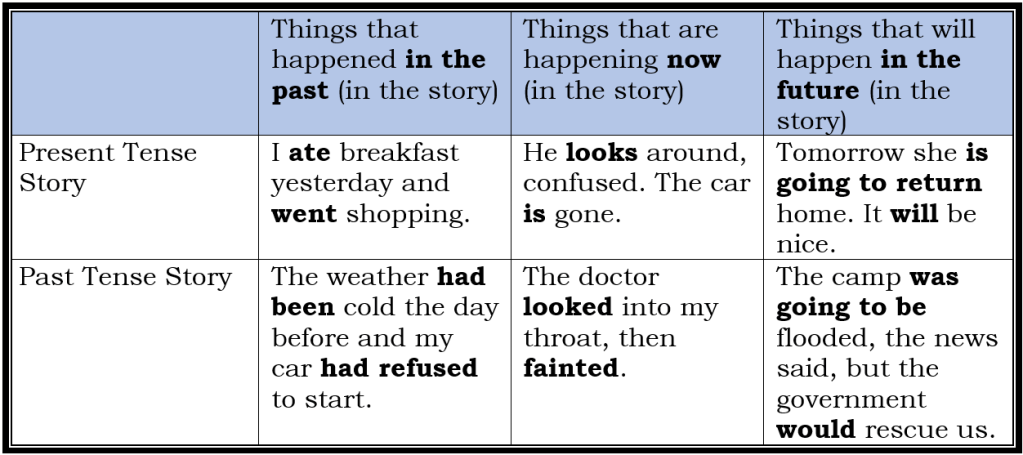The tense of the story means when it is happening, either in the past or the present. This gets into grammar a bit more than other topics, but I am going to try to keep it very simple.