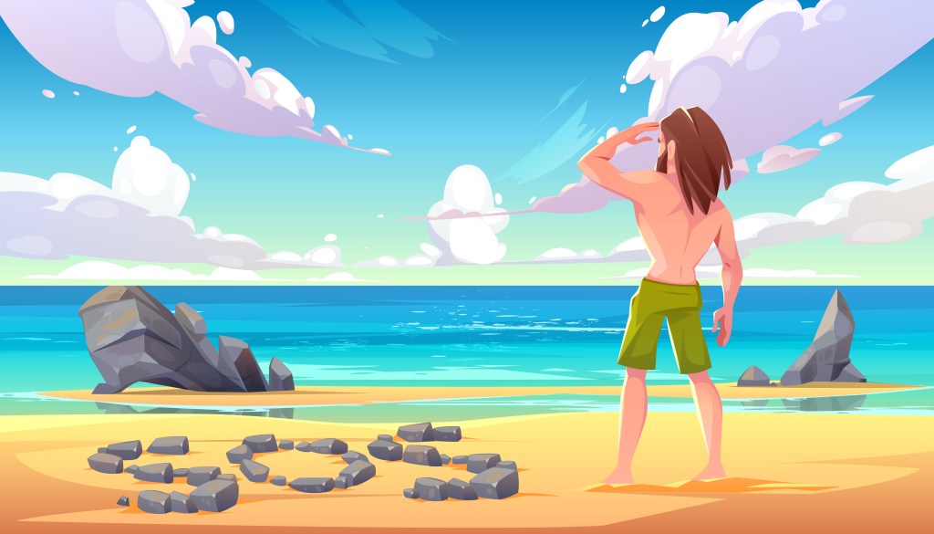 This story is about the characters staying alive, either like Robinson Crusoe because they’re on a desert island or are lost in space or homeless, etc. The middle part of this story is them doing what they need to in order to survive. This might mean finding food or shelter or escaping from someone trying to kill them.