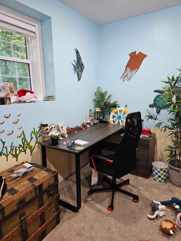 For this one, I thought about going with a sea theme because of the walls but eventually went with this story because of the stuff animals on the floor.